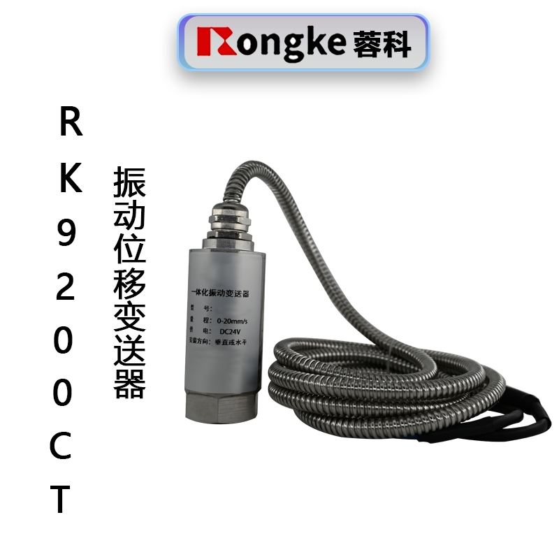 RK9200CT振动位移变送器应用于对关键机械设备轴瓦(机壳)振动幅值进行测量。对应振动幅值0-Kum直接输出4-20mA。